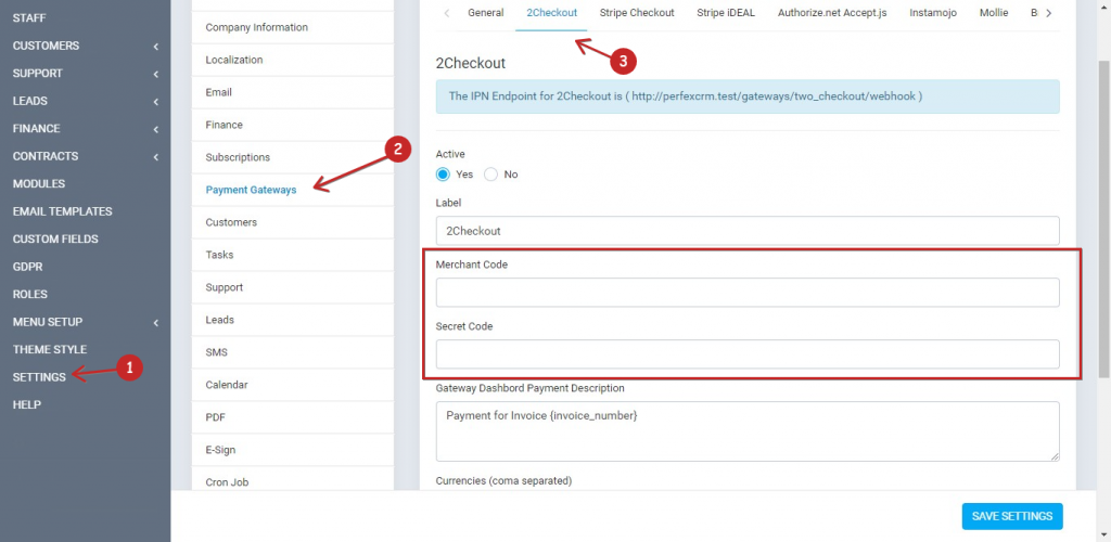 Navegue até Configuração->Configurações->Gateways de pagamento->2Checkout e adicione seu Código do comerciante e Chave secreta nas configurações do gateway