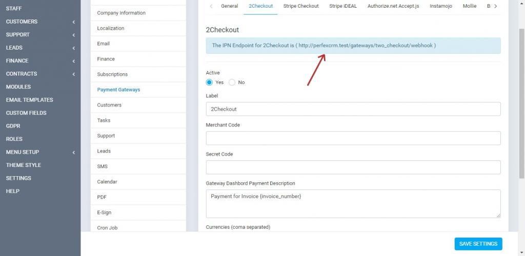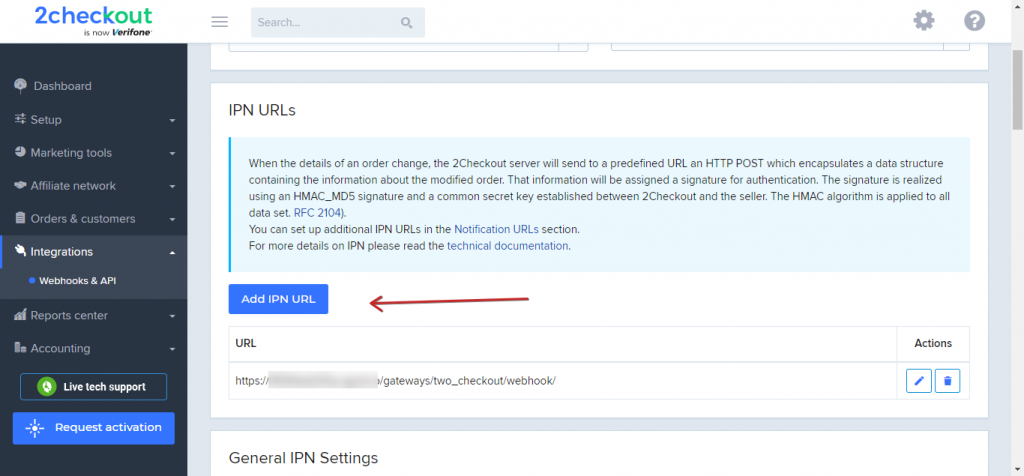 Adicione o URL IPN que você copiou do GrowCRM à sua conta 2Checkout, conforme mostrado abaixo