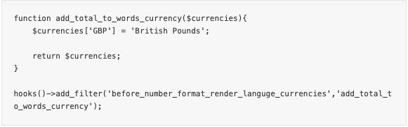 O Perfex vem com 2 nomes de moedas predefinidos que já estão adicionados ao conversor. Se você adicionou sua própria moeda, precisará adicioná-la também ao conversor de total para palavras.