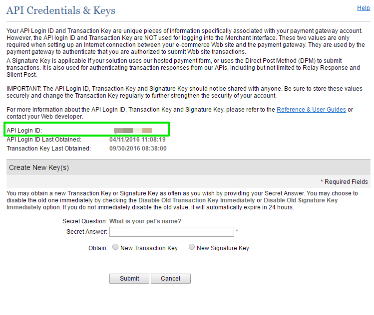 Você precisará obter o ID de login da API e Chave de transação, seu ID de login da API será exibido na página atual