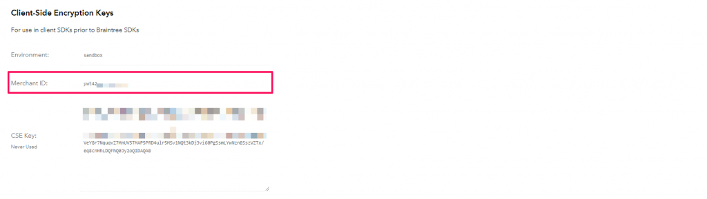 6. Role até o final da página e encontre seu ID do Comerciante e adicione-o em Configuração->Configurações->Gateways de Pagamento->Braintree