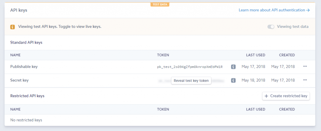 Se você tiver alternado “Exibir dados de teste“, o Stripe mostrará as chaves de teste; caso contrário, as chaves ativas serão mostradas.