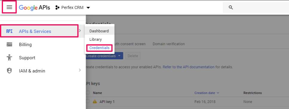 Clique no ícone de alternância na barra lateral superior esquerda e depois em APIs e Serviços -> Credenciais para criar uma nova chave de API.