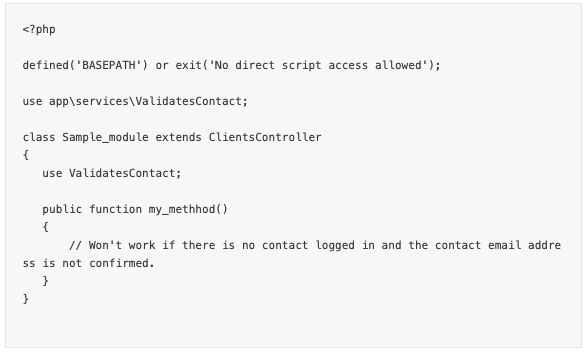 Se você estender o ClientsController e quiser que o controlador seja acessado somente por contatos logados e com endereço de e-mail confirmado, você pode usar nossa característica, a característica verificará isso para você e executará as ações necessárias.