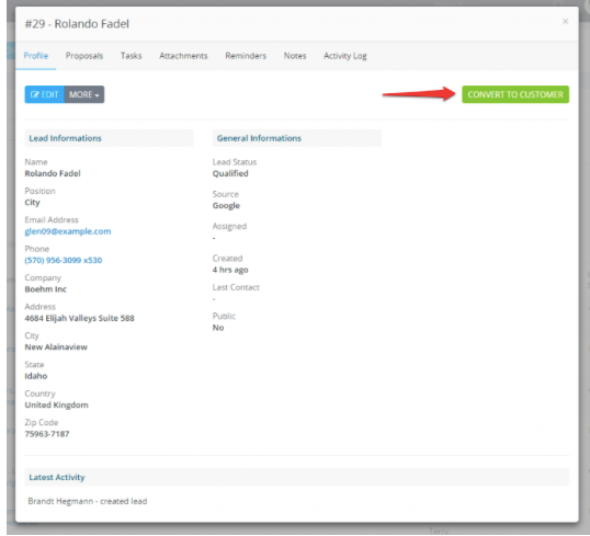 - Clique no lead e aguarde a abertura do modal. No botão superior, clique em “Converter para cliente”.