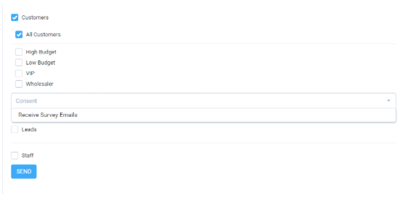 Se você GDPR habilitou e autorizou o consentimento para o GDPR para contatos ou leads, você pode selecionar a pesquisa a ser enviada a contatos/leads específicos que deram consentimento para uma finalidade. Por exemplo, se você adicionou a equação de finalidade de consentimento:Receber e-mails de pesquisa, no menu suspenso você pode selecionar essa finalidade de consentimento e somente os contatos/leads que deram consentimento para receber e-mails de pesquisa receberão a pesquisa.