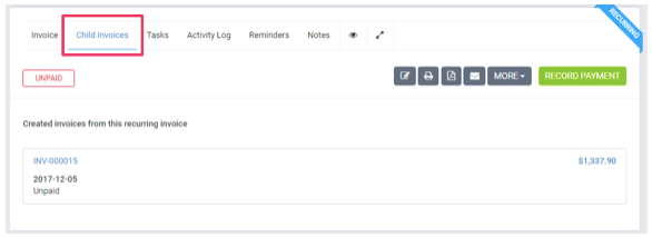 Quando as faturas desta fatura forem geradas, você terá uma visão geral de quais faturas são geradas a partir desta fatura na guia Faturas filhas.