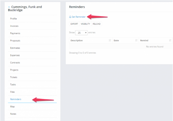 Definir lembretes para os clientes é muito fácil: acesse o perfil do cliente na área administrativa e clique na aba “Lembretes”.