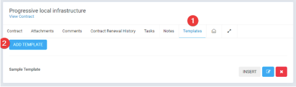 Depois de criar o modelo, você poderá usá-lo e inseri-lo no conteúdo do editor facilmente.Enquanto estiver no guia Modelos, para o modelo que você deseja inserir, clique no botão Inserir, o conteúdo do modelo será automaticamente injetado no editor de contratos.