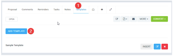 Depois de criar o modelo, você poderá usá-lo e inseri-lo no conteúdo do editor facilmente.Na guia Modelos, para o modelo que você deseja inserir, clique no botão Inserir, o conteúdo do modelo será automaticamente injetado no editor de propostas.