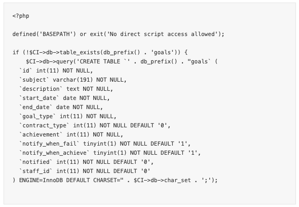Aqui está um exemplo do módulo Acompanhamento de Metas arquivo install.php.