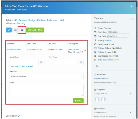 As planilhas de horas de tarefas são todos os cronômetros iniciados para uma tarefa específica. As planilhas de horas são armazenadas separadamente para cada tarefa iniciada pelos responsáveis.