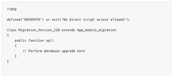 Para nosso exemplo, você deve criar um arquivo de migração e.q. 110_version_110.php com o seguinte conteúdo: