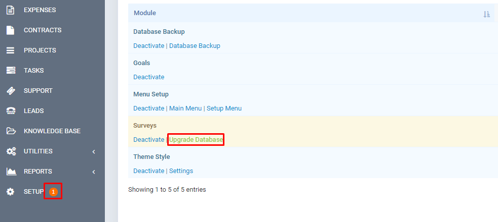 Então você lança a versão 1.1.0 e o usuário carrega/instala novamente os arquivos do módulo, o GrowCRM determinará que a versão do cabeçalho do arquivo não é a mesma que a armazenada no banco de dados e mostrará uma mensagem ao usuário para atualizar o banco de dados.