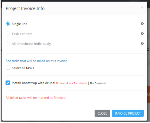Com o GrowCRM, você pode escolher quais tarefas faturar ao faturar um projeto.