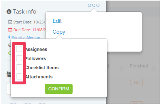 Além dos dados regulares da tarefa, você pode copiar atribuições, seguidores, anexos e itens da lista de verificação.