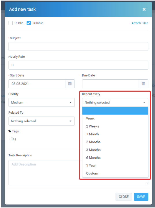 - No campo recorrente, selecione o intervalo de repetição. Você também pode selecionar um intervalo personalizado para atender às suas necessidades.