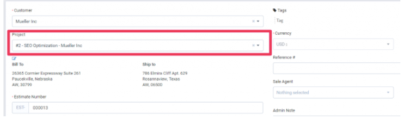 7. Navegue até a área de projetos e clique na aba Vendas -> Orçamentos. Você poderá ver o orçamento recém-criado associado ao projeto selecionado.
