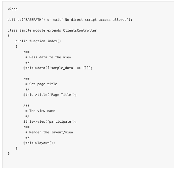 Quando seu módulo precisar carregar um arquivo de visualização para a área de tema, certifique-se de que seu controlador estenda o ClientsController.