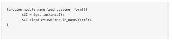Na maioria dos casos, as visualizações são carregadas a partir dos controladores, mas se você quiser carregar um arquivo de visualização, por exemplo, de um auxiliar ou de uma classe ou função PHP personalizada, será necessário prefixar o arquivo com o nome do seu módulo.